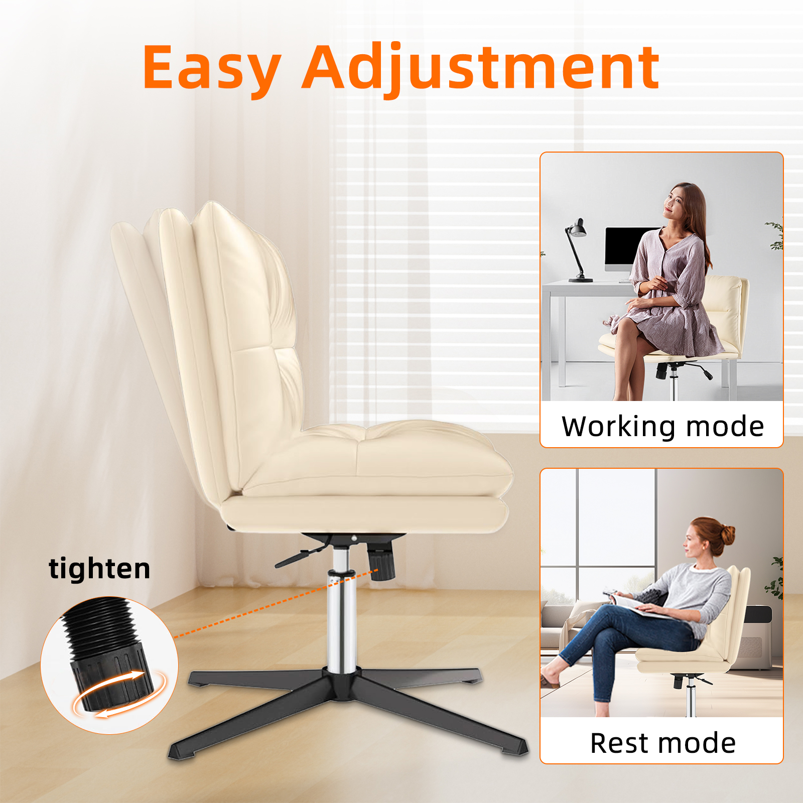 - 【Easy to adjust, easy to lie down】Lean back after a busy day to soothe your shoulders and relax your body and mind. Adjust the height from 18.5 inches to 24 inches by swinging the armless office chair up and down; lean back for 90°-130° of flexible recline; adjust the bottom knob to adjust the tightness. Fits most desks, dressers and coffee tables.