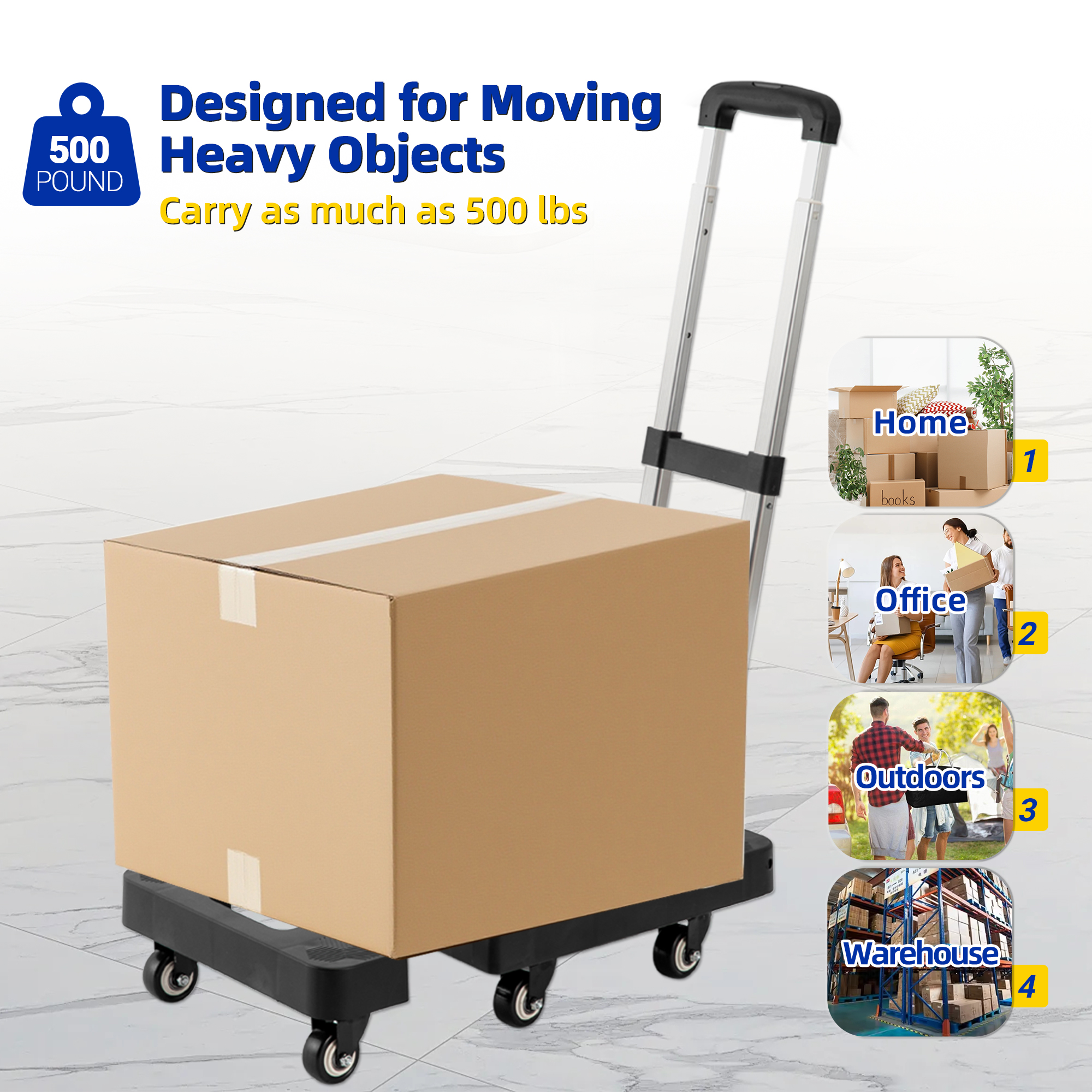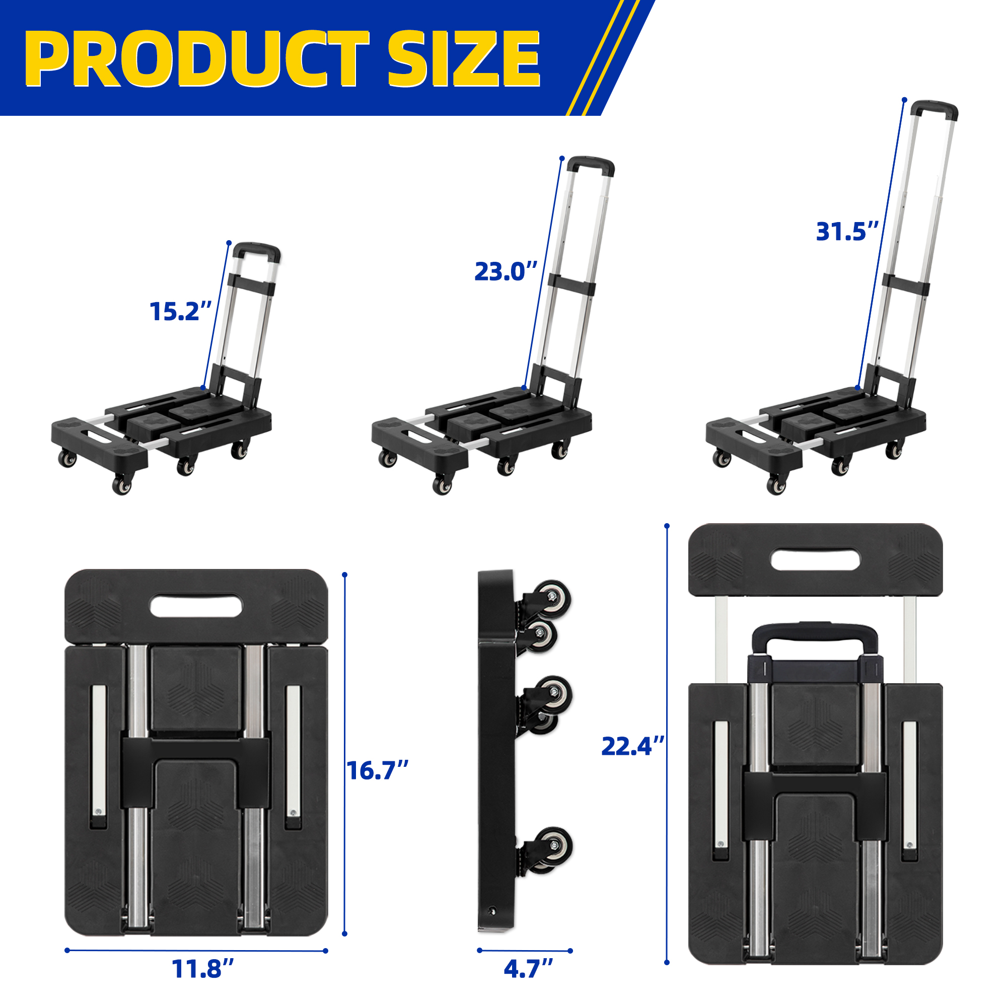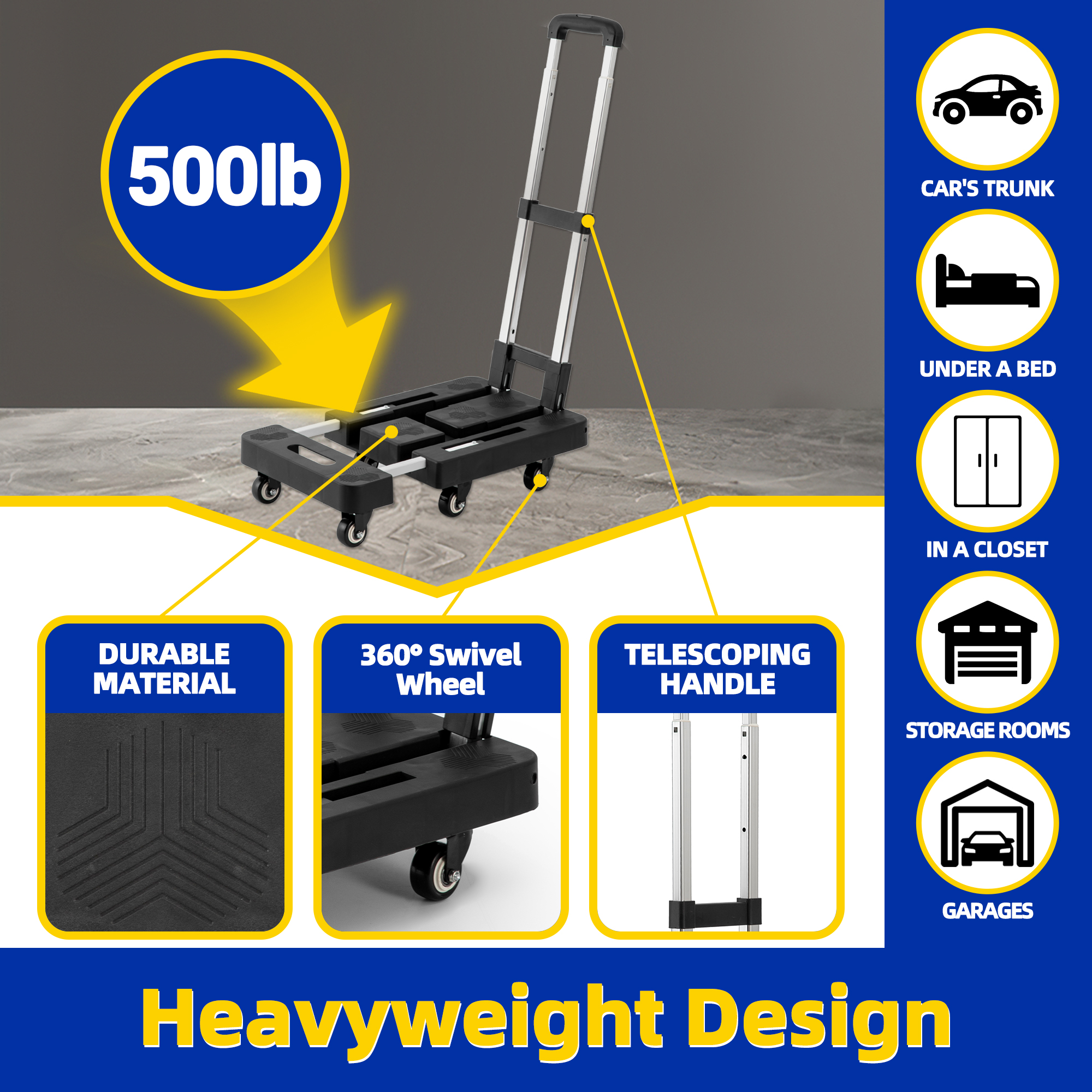 This Heavy-Duty Folding Hand Truck Is Built To Handle Up To 500 Lbs, Making It Perfect For Moving, Shopping, Warehouse Work, And Travel. The 6 Smooth-Rolling Wheels Provide 360° Maneuverability, While The Extendable Steel-Reinforced Platform Adjusts From 16.7" (Compact) To 22.4" (Extended) To Fit Bulky Boxes, Luggage, And Furniture. Ergonomic 3-Height Adjustable Handle (Locks At 15.2", 23.0", Or 31.5") Ensures Comfortable Pushing/Pulling For Users Of All Heights. Folds Flat In Seconds (16.7" L X 11.8" W X 4.5" H) For Easy Storage In Cars, Closets, Or Under Beds. Includes 2 Bungee Cords To Secure Loads. Dimensions: Folded: 16.7" L x 11.8" W x 4.5" H Extended Platform: 22.4" L Handle Heights: 15.2" (Low), 23.0" (Mid), 31.5" (High)