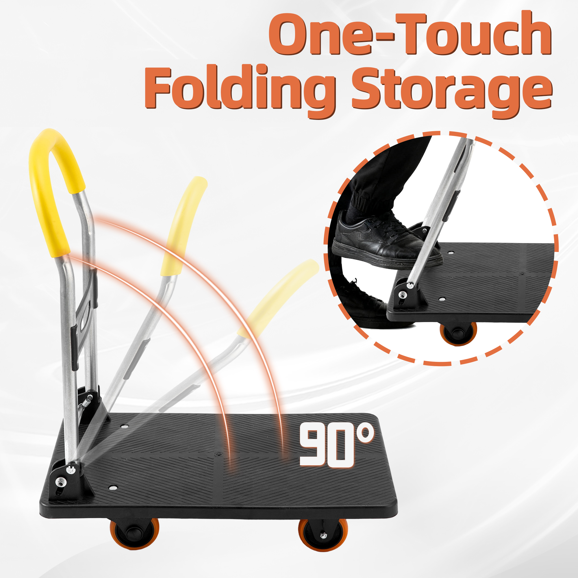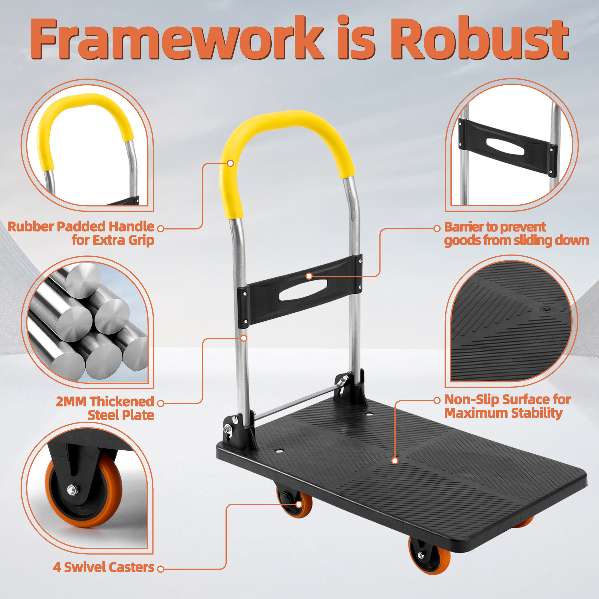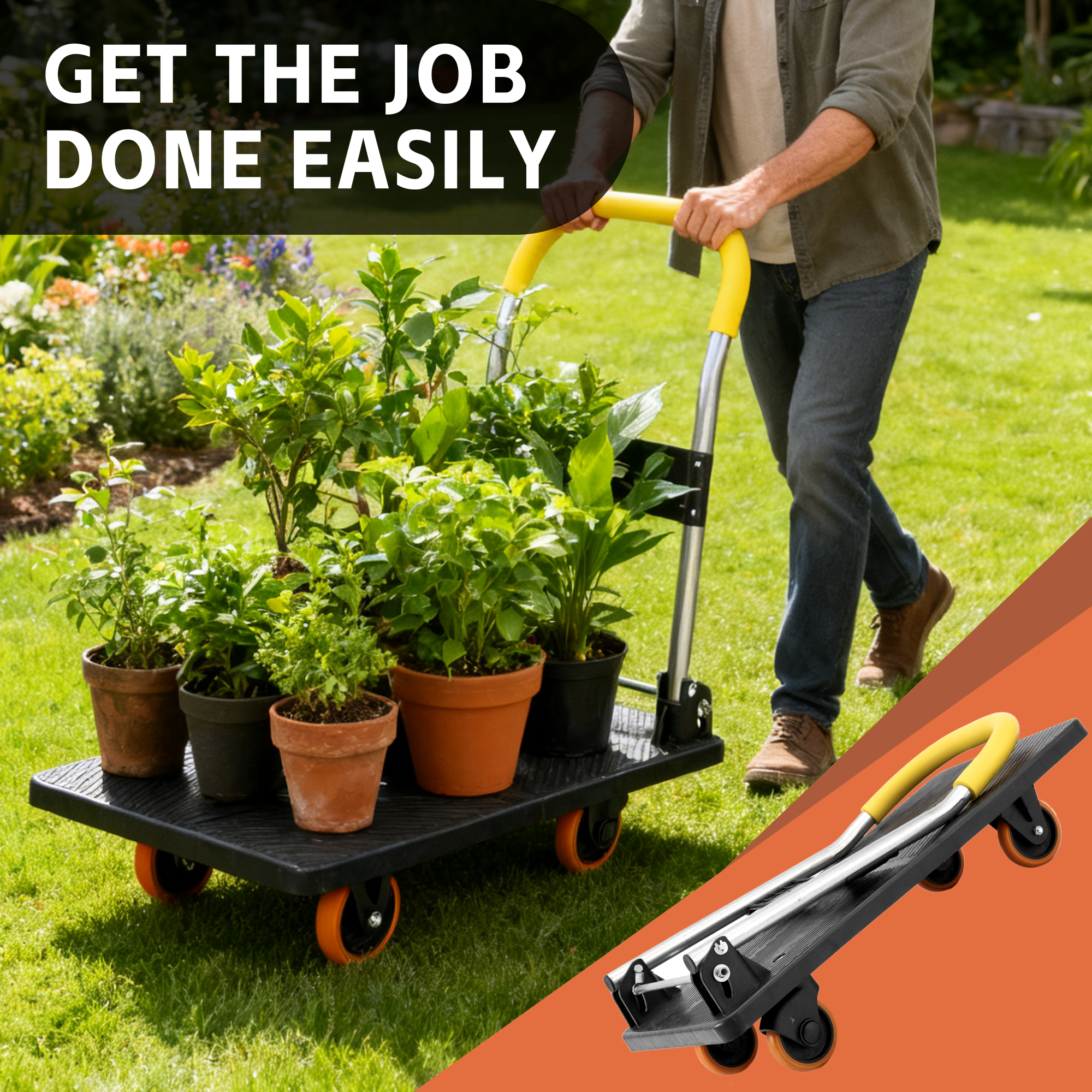 Dimensions (Open): 27.5" L X 16.5" W X 32.7" H Dimensions (Folded): 27.5" L X 16.5" W X 9.4" H Weight Capacity: 1000 Lbs Material: Heavy-Duty Steel Frame + Textured Platform Wheels: 4 X 5" Tpr (4 Swivel) Why Choose This Cart? This Heavy-Duty Folding Utility Cart Combines Strength, Convenience, And Portability. Whether You're Restocking Shelves, Hauling Gardening Supplies, Or Moving Furniture, Its 1000lb Capacity And Compact Foldable Design Make It A Must-Have For Home And Work. Order Now And Simplify Your Heavy Lifting!