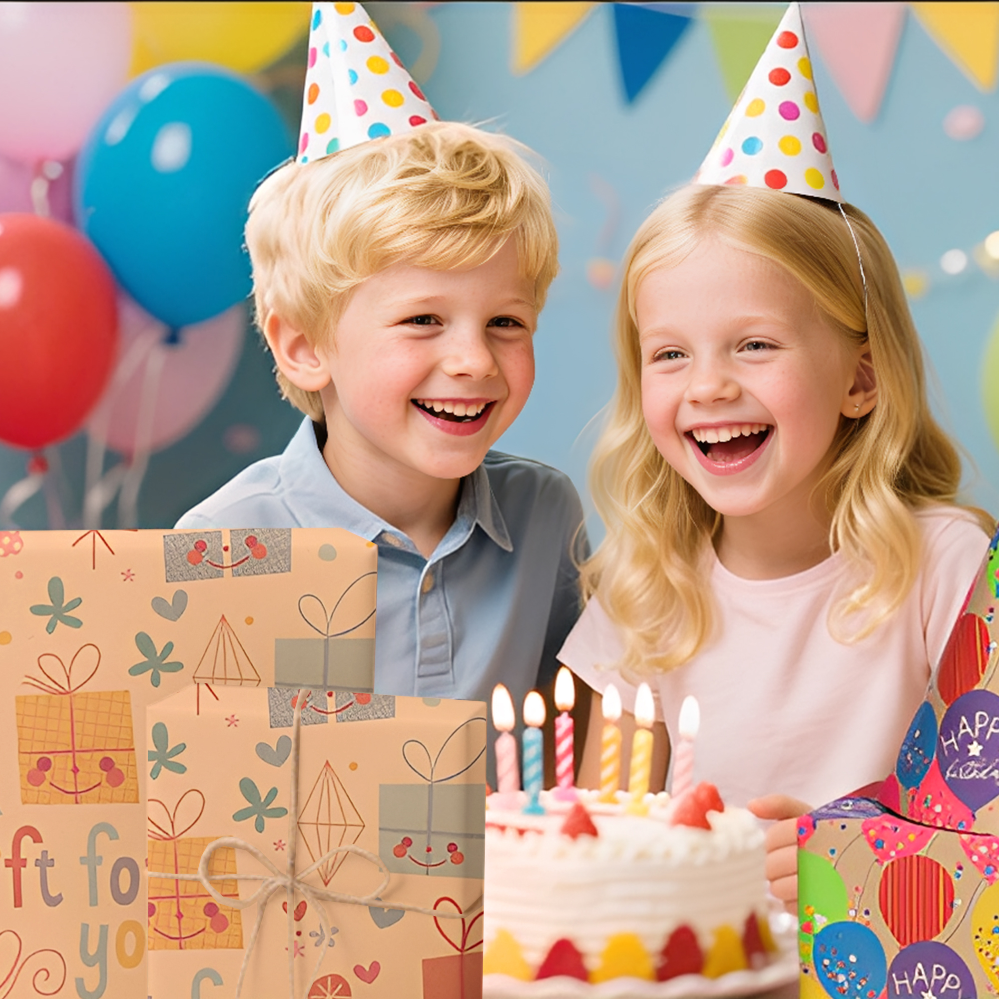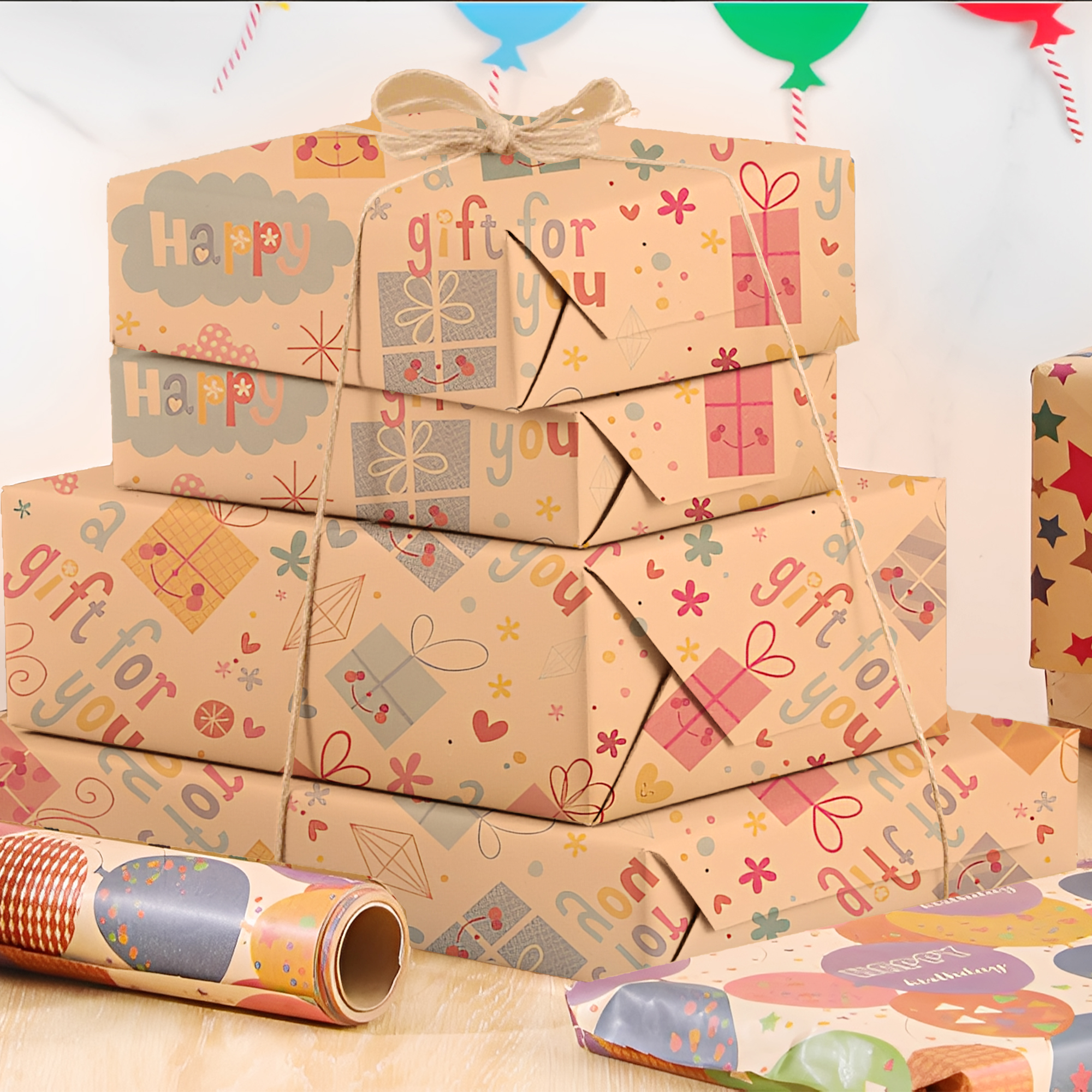 Elevate your gift-giving and party decor with this versatile 20-sheet holiday wrapping paper set. Crafted from durable, eco-friendly kraft paper, the set features a variety of carnival-inspired designs, including festive Christmas elements, colorful balloons, and cheerful birthday cakes. The large 19.6" x 27.5" sheets can be easily cut and wrapped for a wide range of occasions, from Christmas and birthdays to weddings and baby showers. Complemented by stickers and decorative ropes, this all-in-one solution ensures your presents and party decorations stand out with a touch of handcrafted charm.