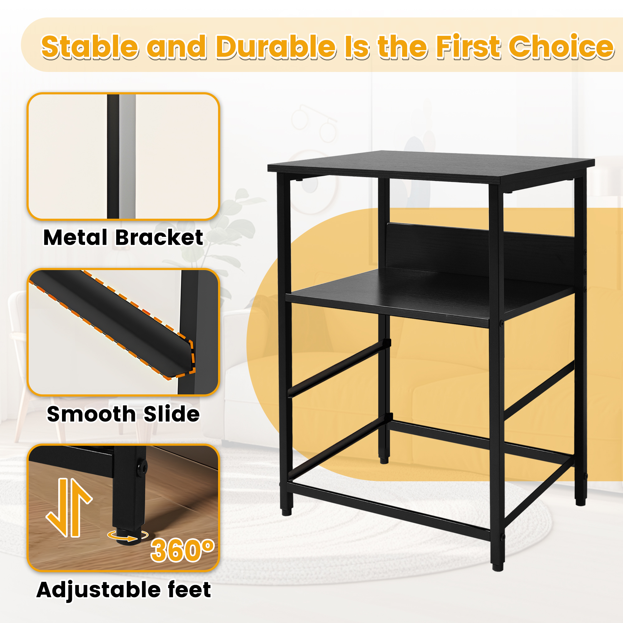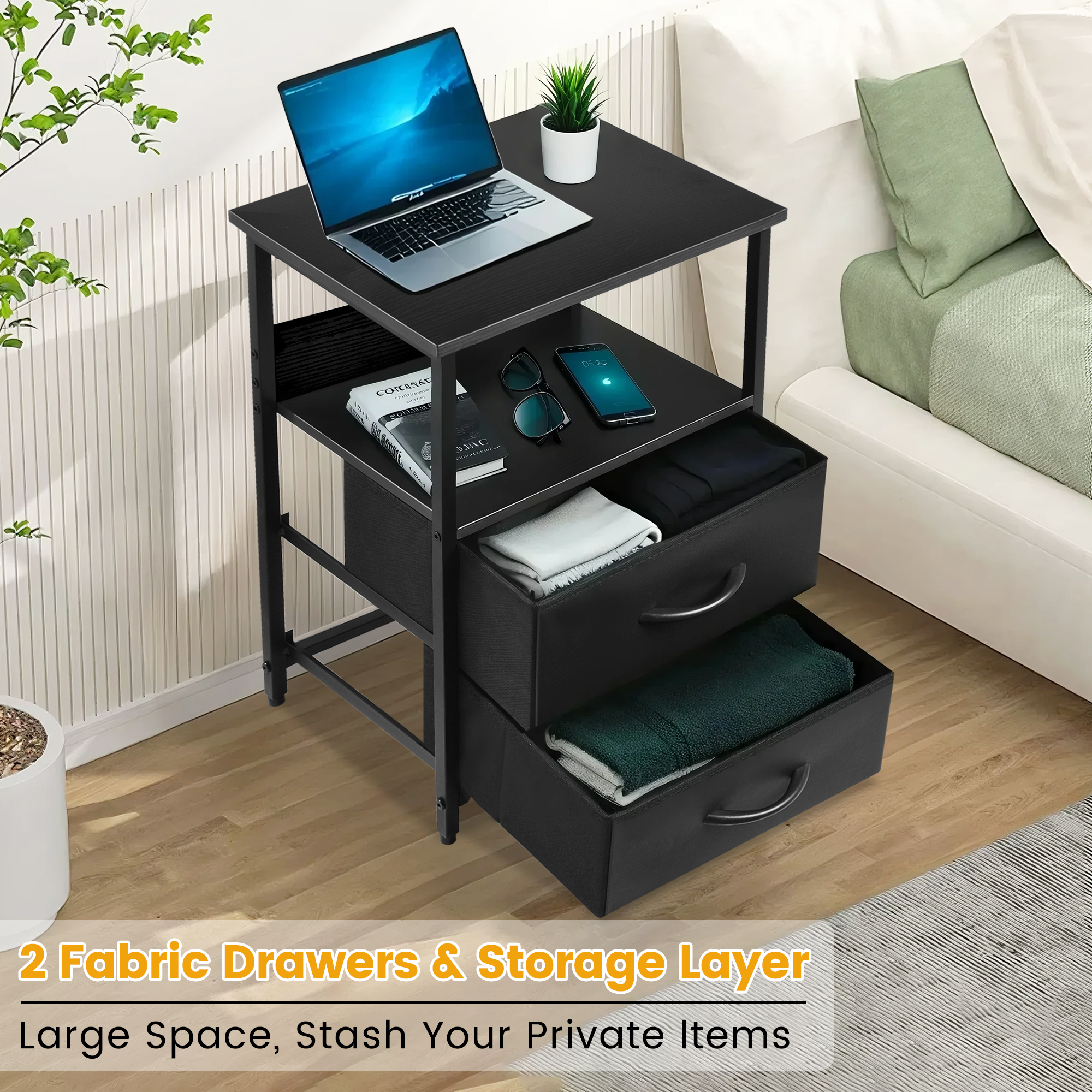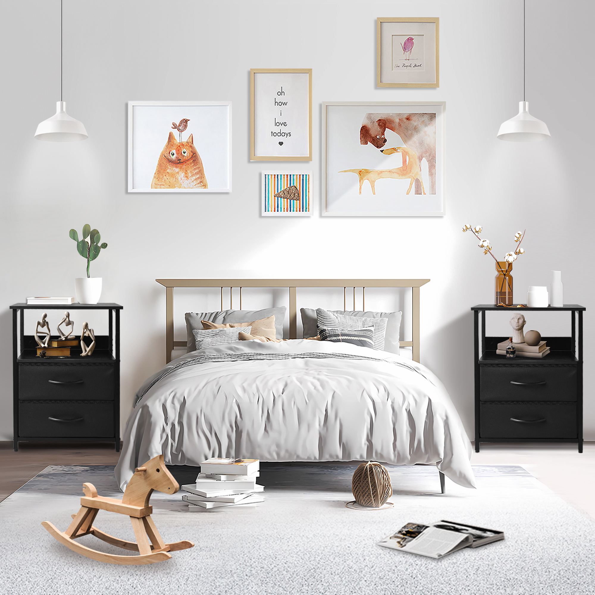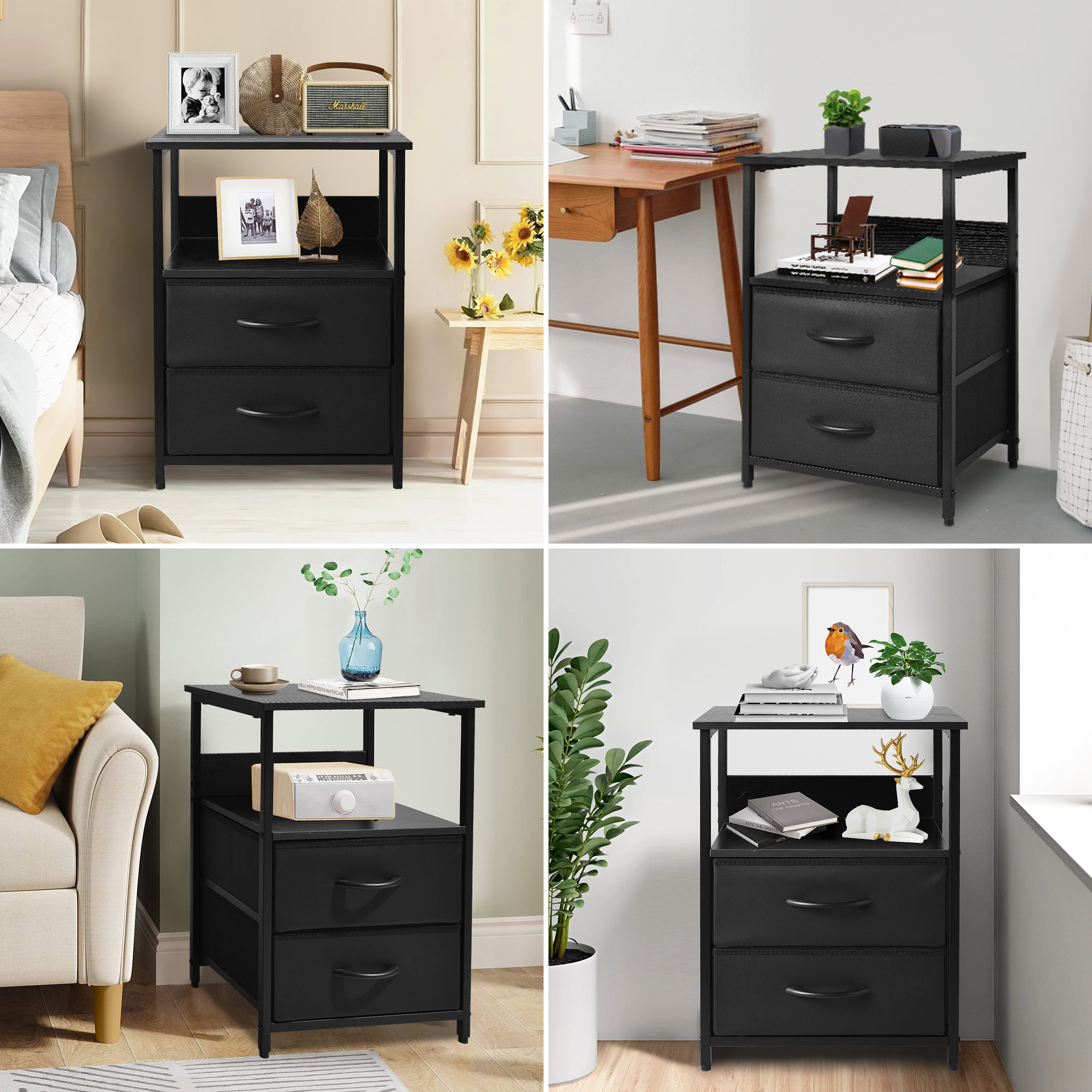 Upgrade your space with this sleek black nightstand! It blends style and functionality, ideal for organizing your bedroom. Boasting 2 roomy fabric drawers with reinforced handles for easy access, plus upper and lower wood shelves for open storage, it’s super practical. The smooth tabletop is a breeze to clean, and the sturdy metal frame ensures long-lasting use. With 4 adjustable feet to keep it stable and prevent floor scratches, plus a back panel to stop items from falling, it’s versatile. Use it as a bedroom nightstand, end table, or small storage solution in the living room. Perfect for adults, kids, and teens.