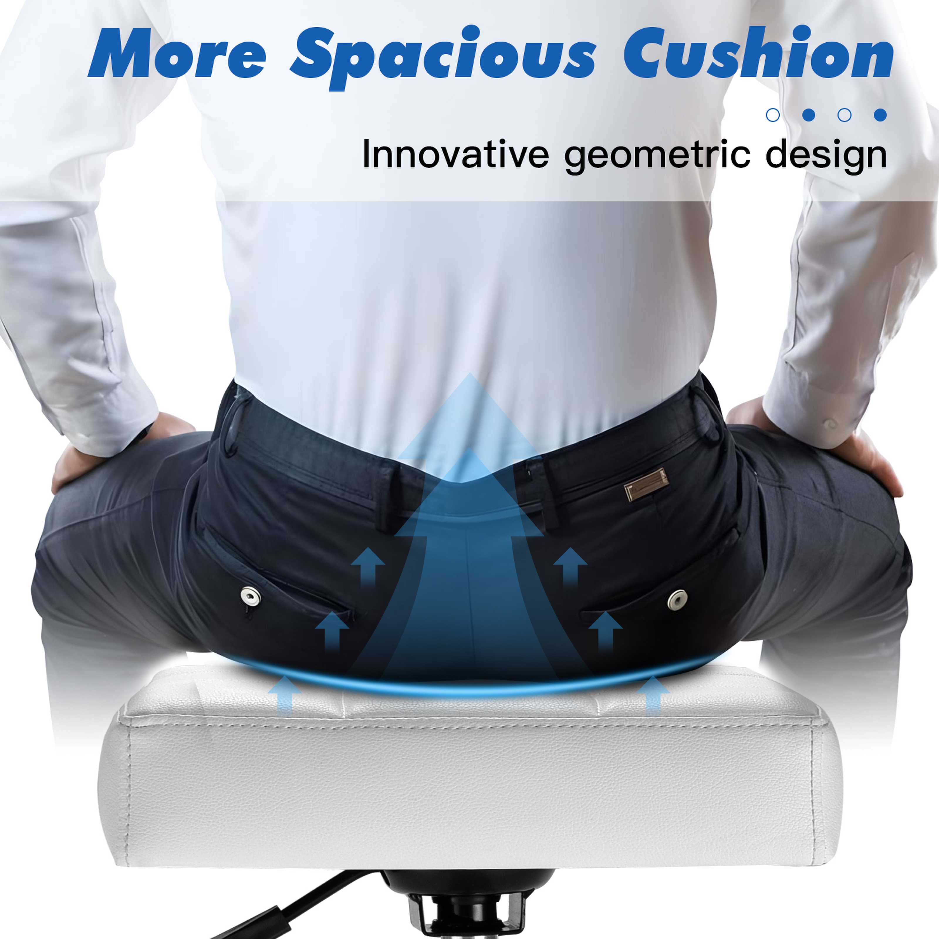 - WIDER AND MORE COMFORTABLE SEATING:Our stool with wheels features a unique geometrically shaped square cushion that provides ultra-stable support and effective pressure dispersion to reduce body fatigue.3.1 inch extra thick high-density sponge is soft and resilient to sit on for a long time without collapsing. The wide seat surface better supports the hips and provides a comfortable experience.