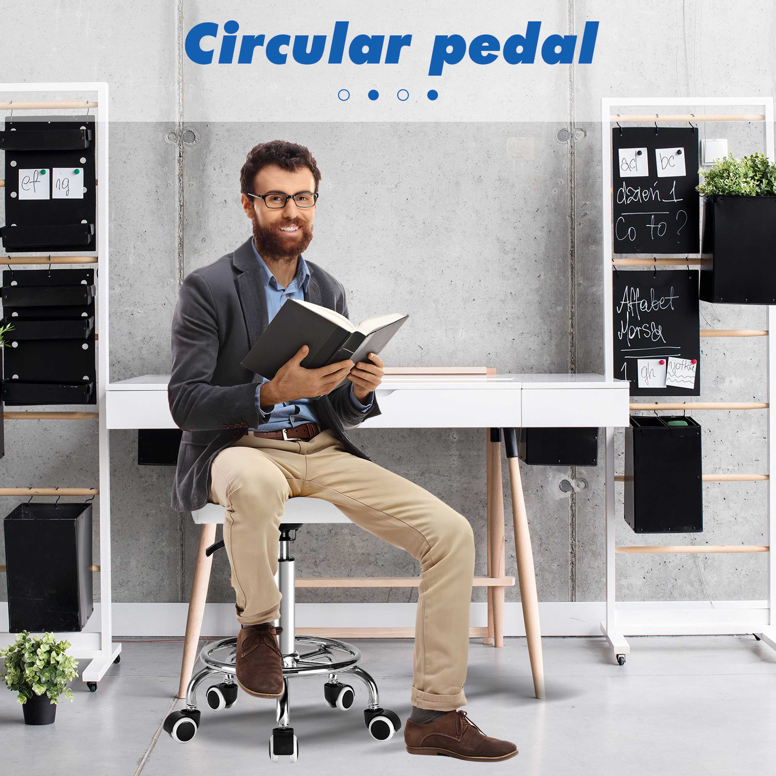 - RING PEDAL:The footrest of the rolling stool is designed to be spacious and comfortable, so your legs can stretch freely and you won't get tired after sitting for a long time. The reasonable wheelbase of the roll around stool ensures stable balance and is not easy to roll over. Lifting and adjusting freely, easy to adapt to different heights and needs, improve sitting posture, the ultimate comfort of the feet, to help efficient work.
