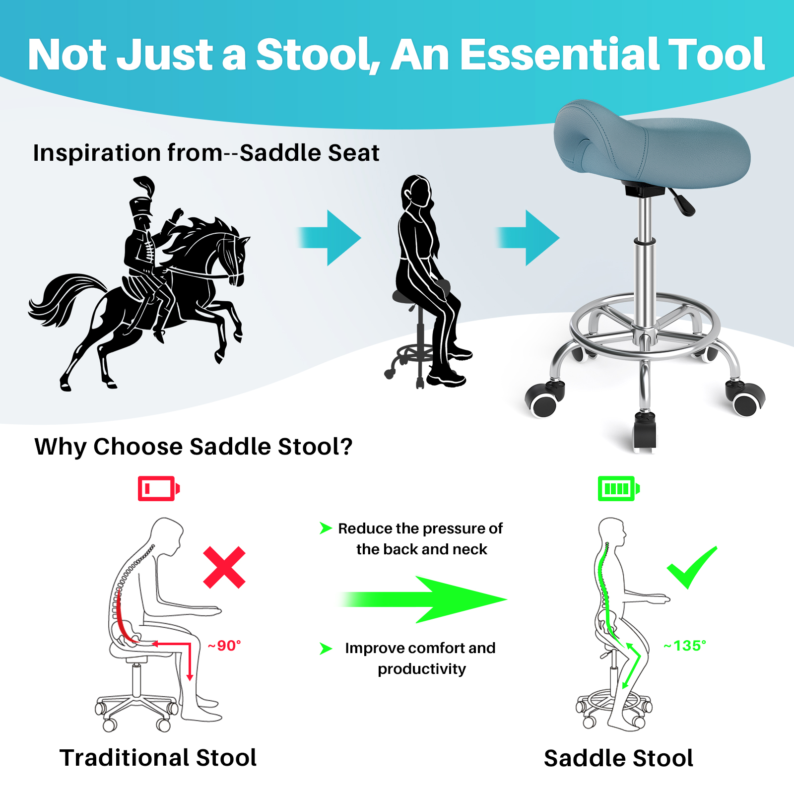 • ERGONOMIC COMFORT: Have a sore back after sitting for long periods of time? Here is the solution for you - saddle stool. The saddle-shaped cushion reduces the pressure accumulated in the buttocks and legs, maximizing body's core muscle strength, adjusting the natural curvature of the spine and therefore ensuruing a healthier and more comfortable sitting experience