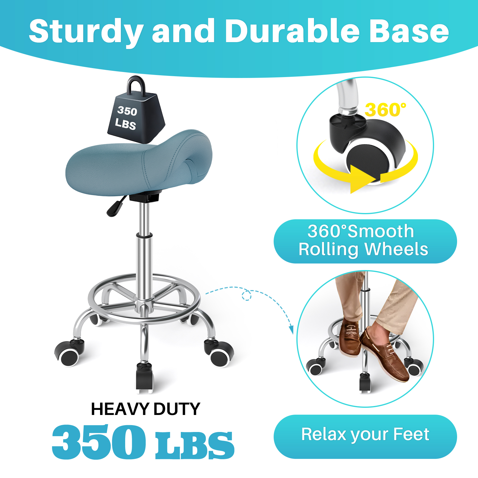 • STURDY BASE with FOOTREST: The saddle stool with wheels has a uniquely designed circular footrest that provides convenient leg support on the metal base constructed with a customized steel structure that has a high load-bearing capacity, holding up to 350 pounds. Every part of the stool is carefully crafted for durability without the loss of quality and safety