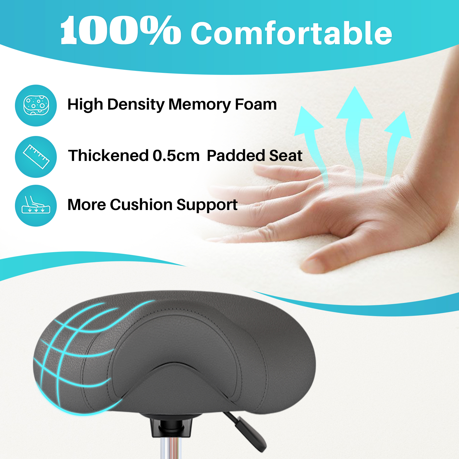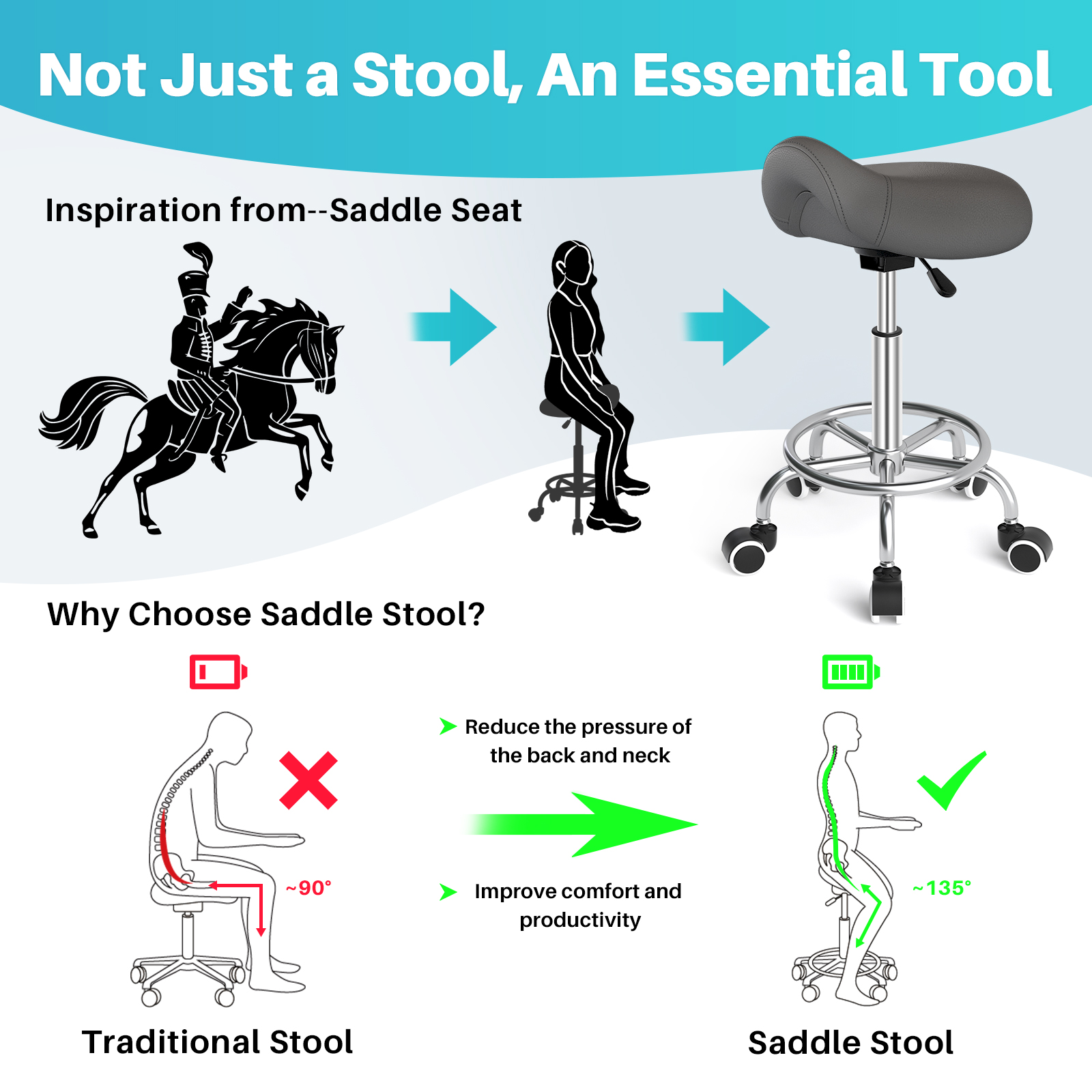 - ERGONOMIC COMFORT: Have a sore back after sitting for long periods of time? Here is the solution for you - saddle stool. The saddle-shaped cushion reduces the pressure accumulated in the buttocks and legs, maximizing body's core muscle strength, adjusting the natural curvature of the spine and therefore ensuruing a healthier and more comfortable sitting experience