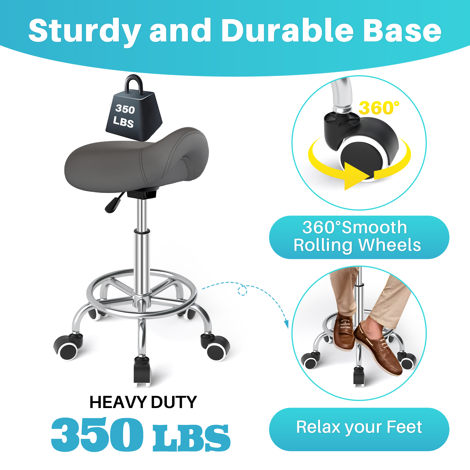 - STURDY BASE with FOOTREST: The saddle stool with wheels has a uniquely designed circular footrest that provides convenient leg support on the metal base constructed with a customized steel structure that has a high load-bearing capacity, holding up to 350 pounds. Every part of the stool is carefully crafted for durability without the loss of quality and safety