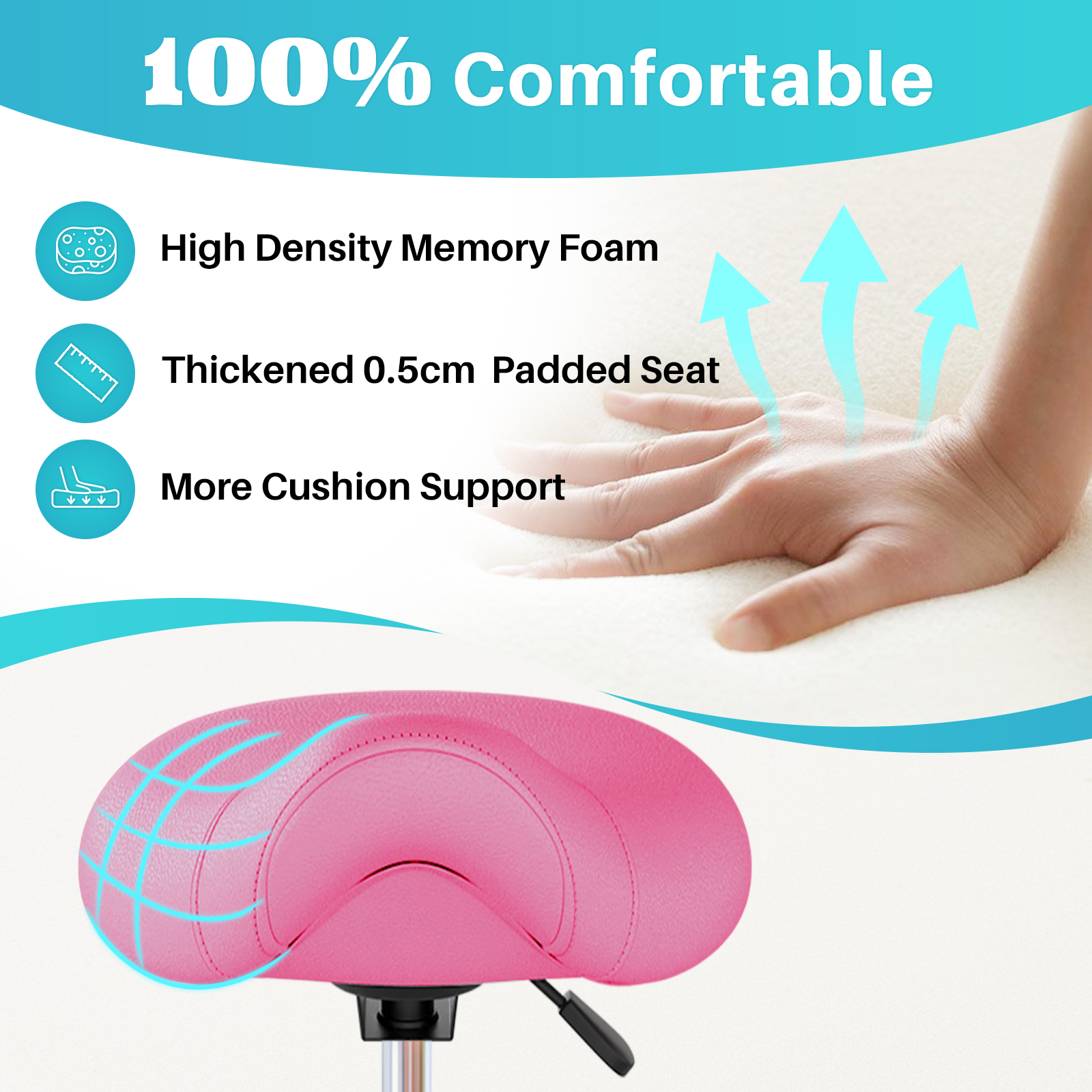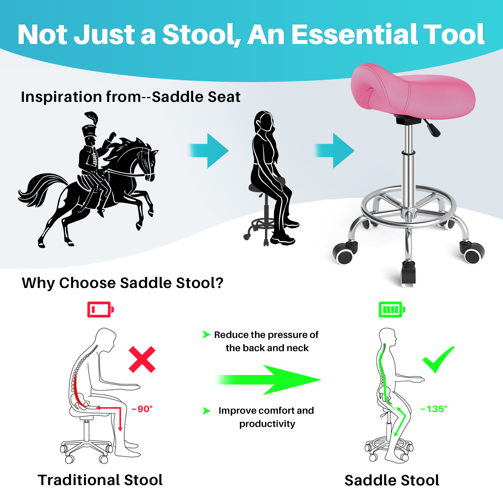 - ERGONOMIC COMFORT: Have a sore back after sitting for long periods of time? Here is the solution for you - saddle stool. The saddle-shaped cushion reduces the pressure accumulated in the buttocks and legs, maximizing body's core muscle strength, adjusting the natural curvature of the spine and therefore ensuruing a healthier and more comfortable sitting experience