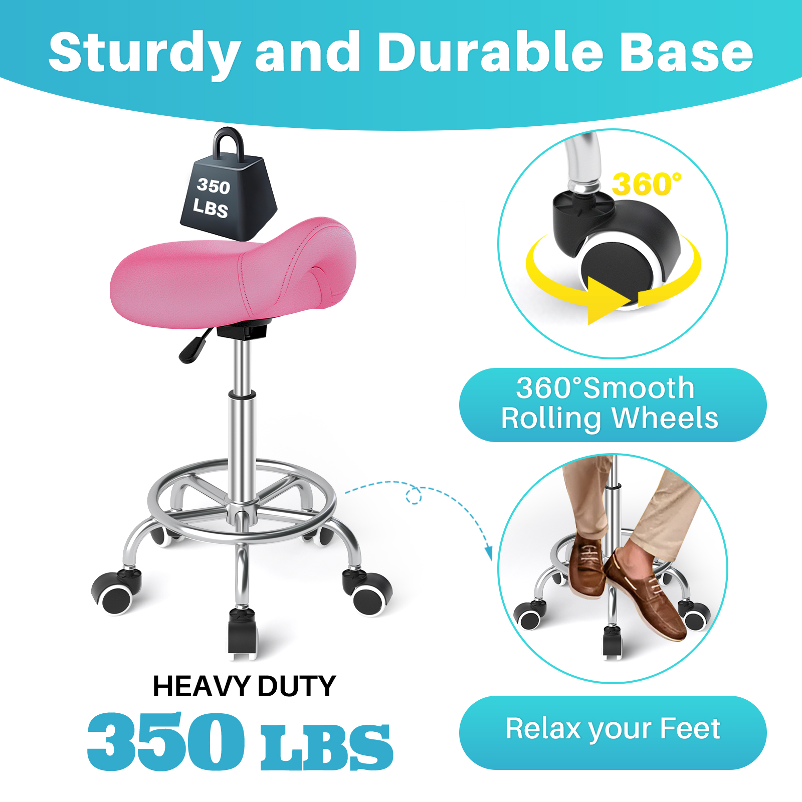 - STURDY BASE with FOOTREST: The saddle stool with wheels has a uniquely designed circular footrest that provides convenient leg support on the metal base constructed with a customized steel structure that has a high load-bearing capacity, holding up to 350 pounds. Every part of the stool is carefully crafted for durability without the loss of quality and safety