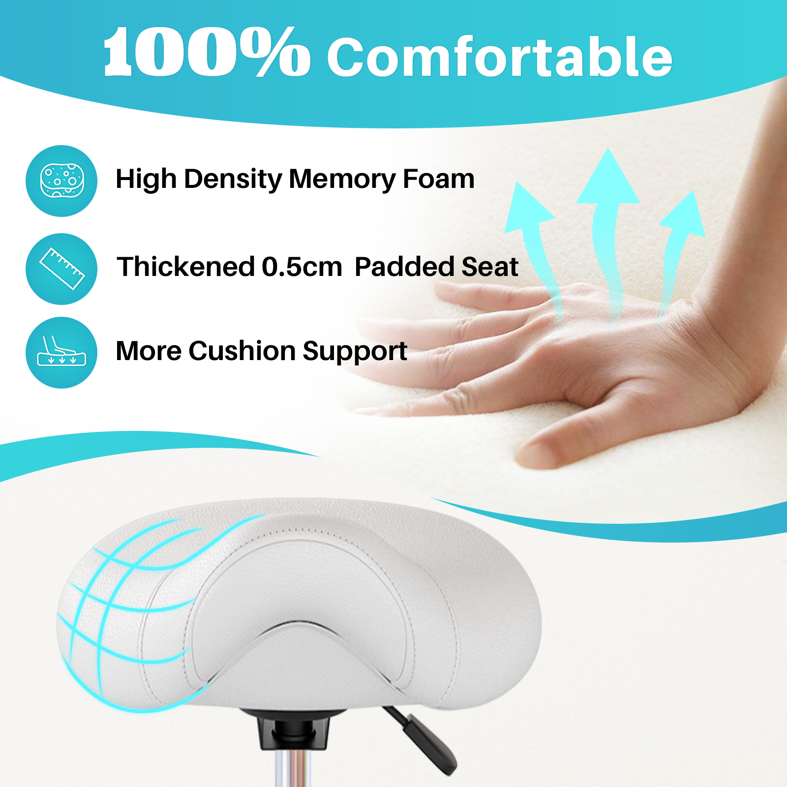 • THICKENED SEAT CUSHION: PU leather covered on the surface enables the saddle chair to be waterproof, durable and easy to clean. The 5mm thicker cushion is condensed with high-density memory foam, enhancing robust cushioning and optimal comfort for long hours of work; while the 16-inch wider seat cushion provides more seating space. Just sit at your ease