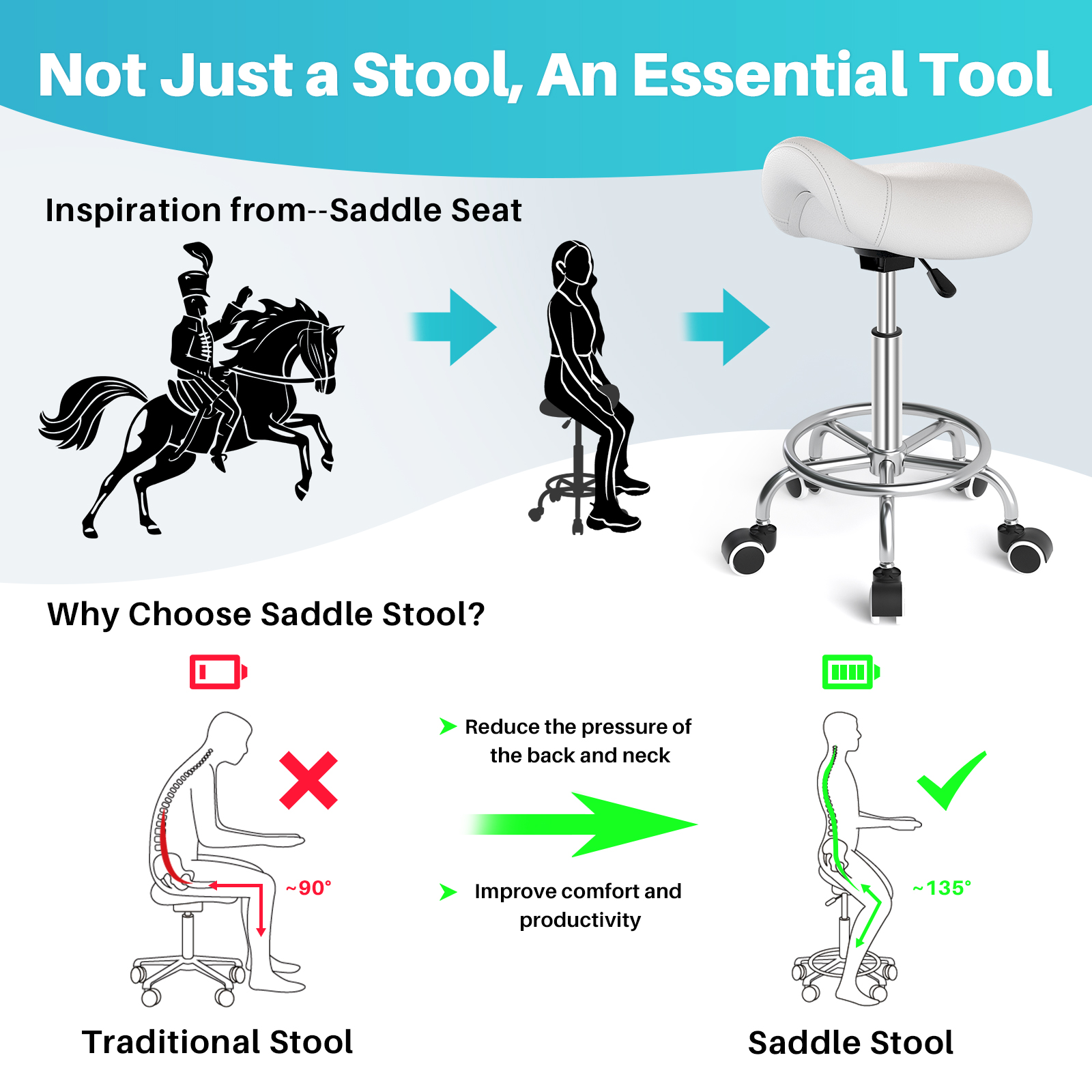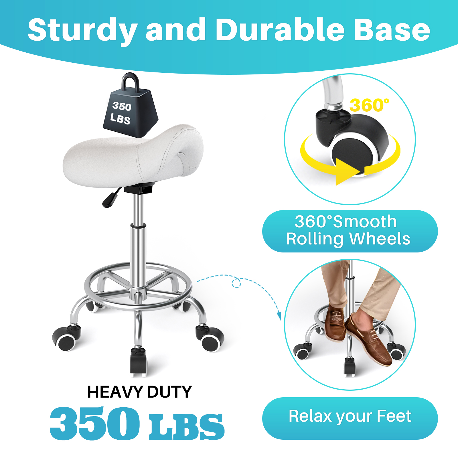 • STURDY BASE with FOOTREST: The saddle stool with wheels has a uniquely designed circular footrest that provides convenient leg support on the metal base constructed with a customized steel structure that has a high load-bearing capacity, holding up to 350 pounds. Every part of the stool is carefully crafted for durability without the loss of quality and safety