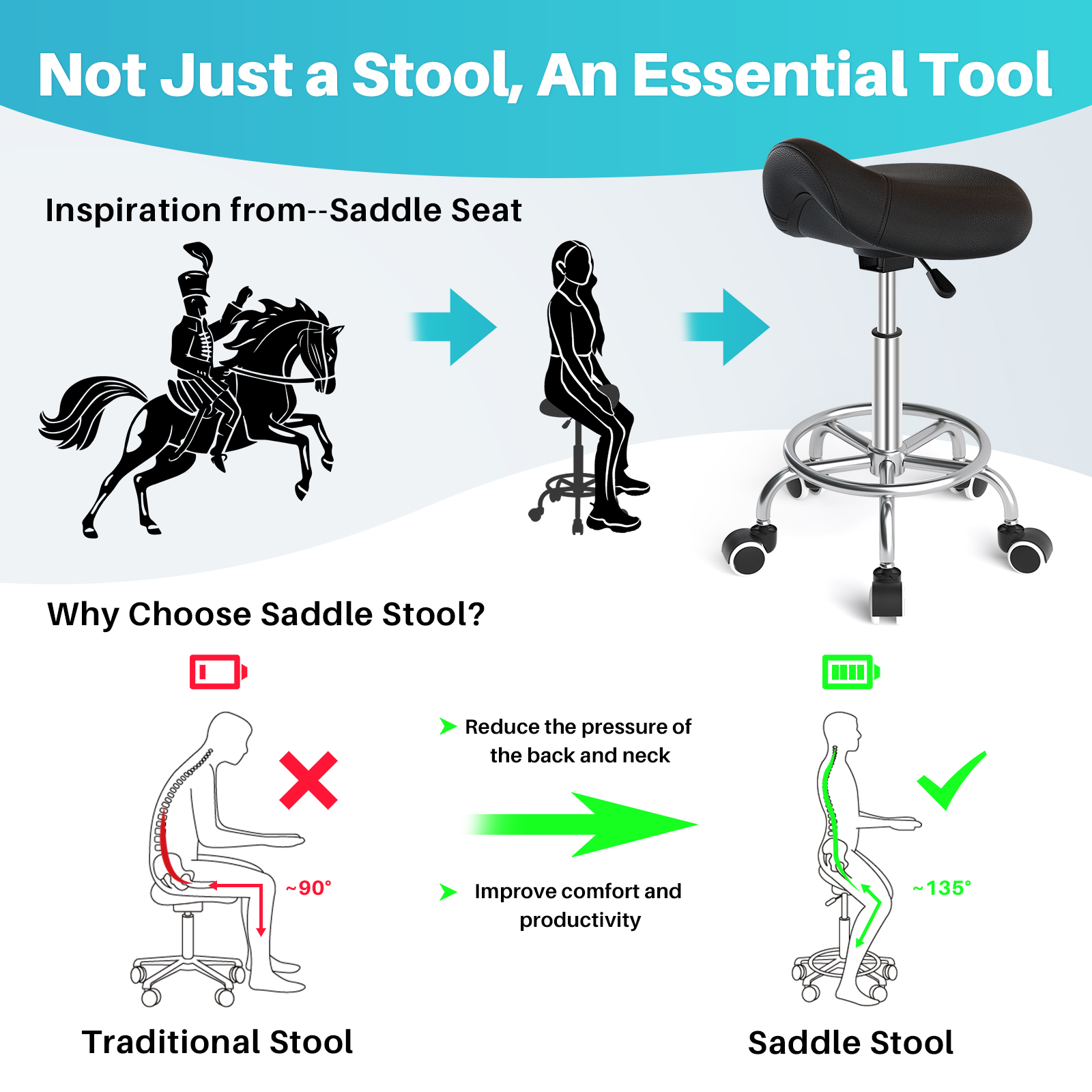 • ERGONOMIC COMFORT: Have a sore back after sitting for long periods of time? Here is the solution for you - saddle stool. The saddle-shaped cushion reduces the pressure accumulated in the buttocks and legs, maximizing body's core muscle strength, adjusting the natural curvature of the spine and therefore ensuruing a healthier and more comfortable sitting experience