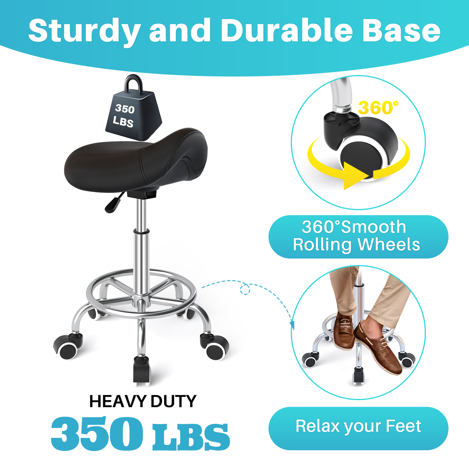 • STURDY BASE with FOOTREST: The saddle stool with wheels has a uniquely designed circular footrest that provides convenient leg support on the metal base constructed with a customized steel structure that has a high load-bearing capacity, holding up to 350 pounds. Every part of the stool is carefully crafted for durability without the loss of quality and safety