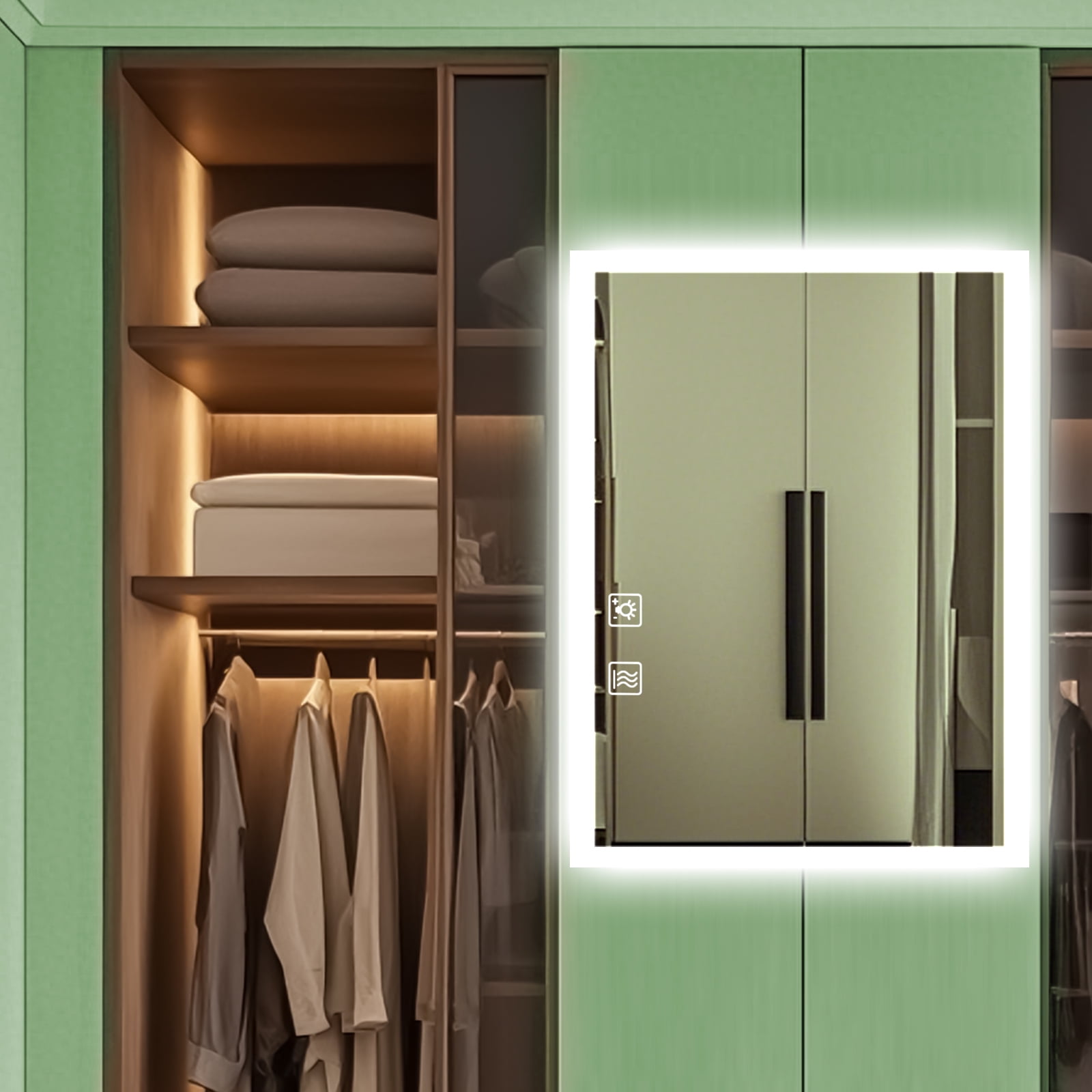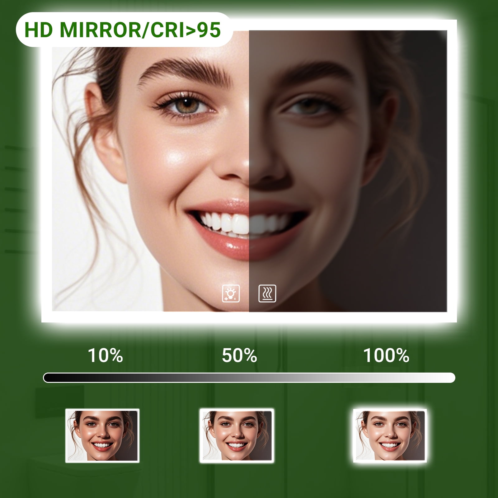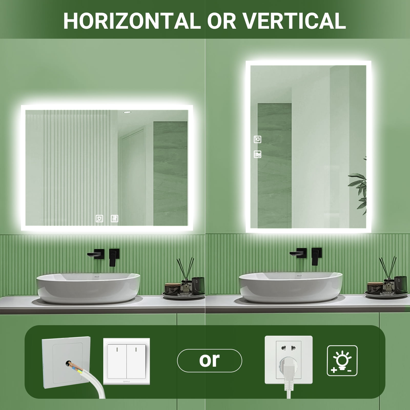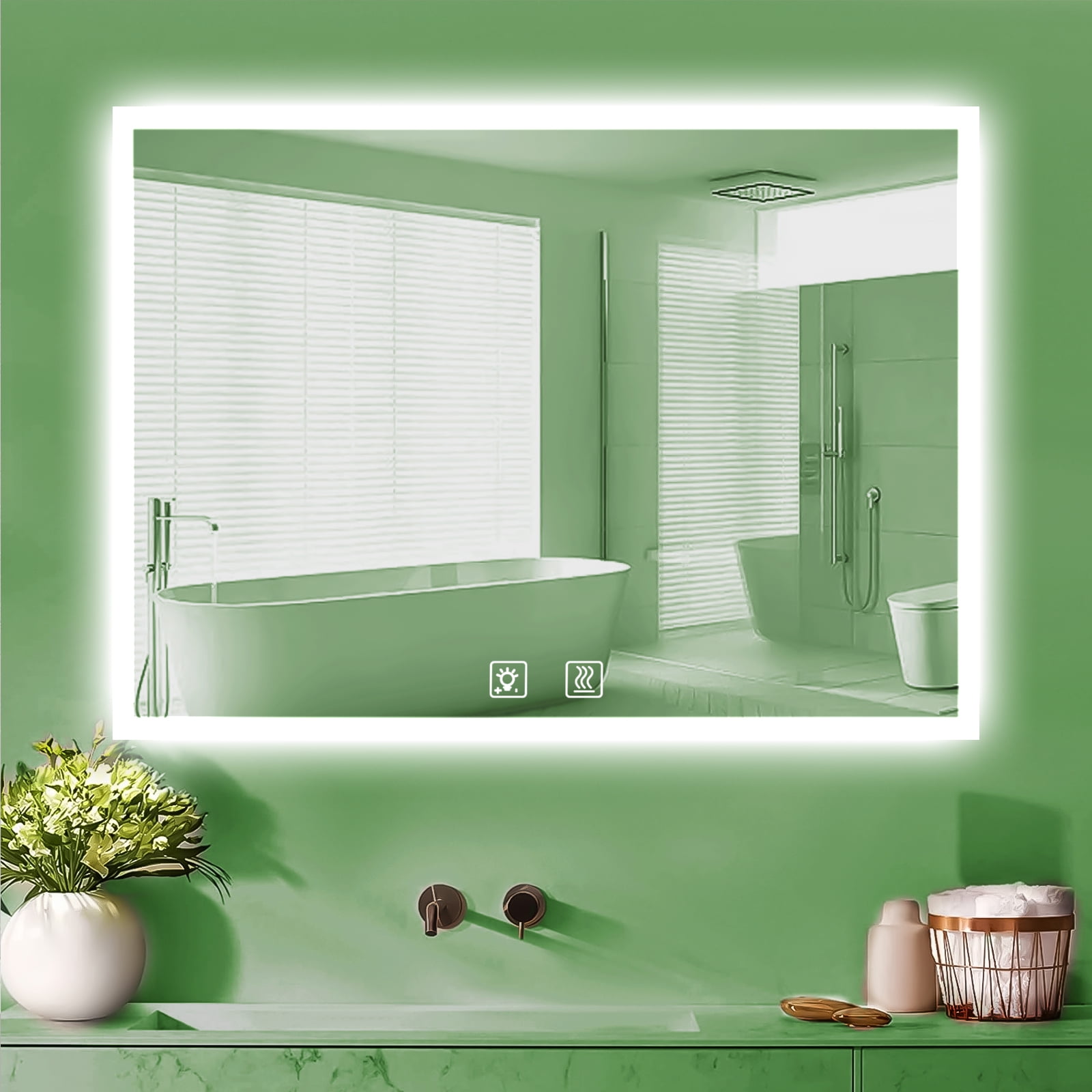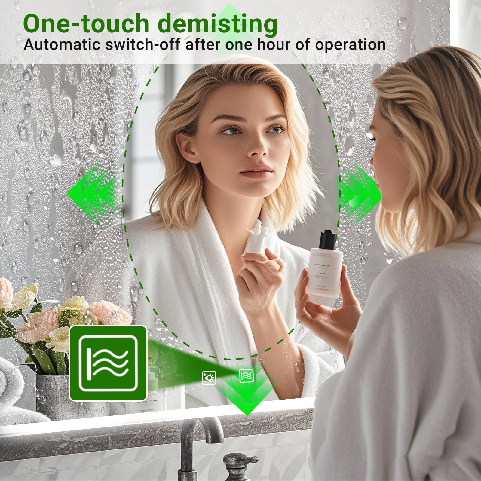 - Automatic anti-fog function heats up the mirror to prevent fogging, ensuring a clear reflection even after a hot shower, and automatically turns off after an hour for safety and energy efficiency.