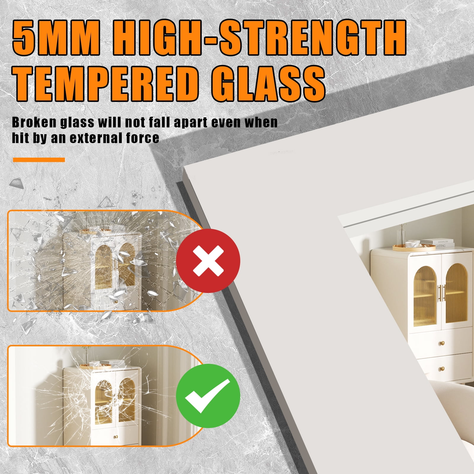 - Constructed with 5MM tempered glass that is 5 times stronger than ordinary mirrors, ensuring durability and resistance to shattering.